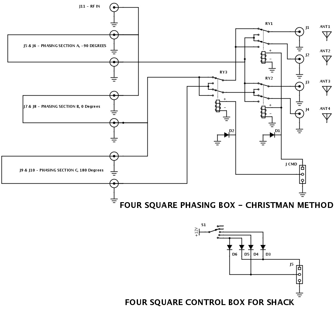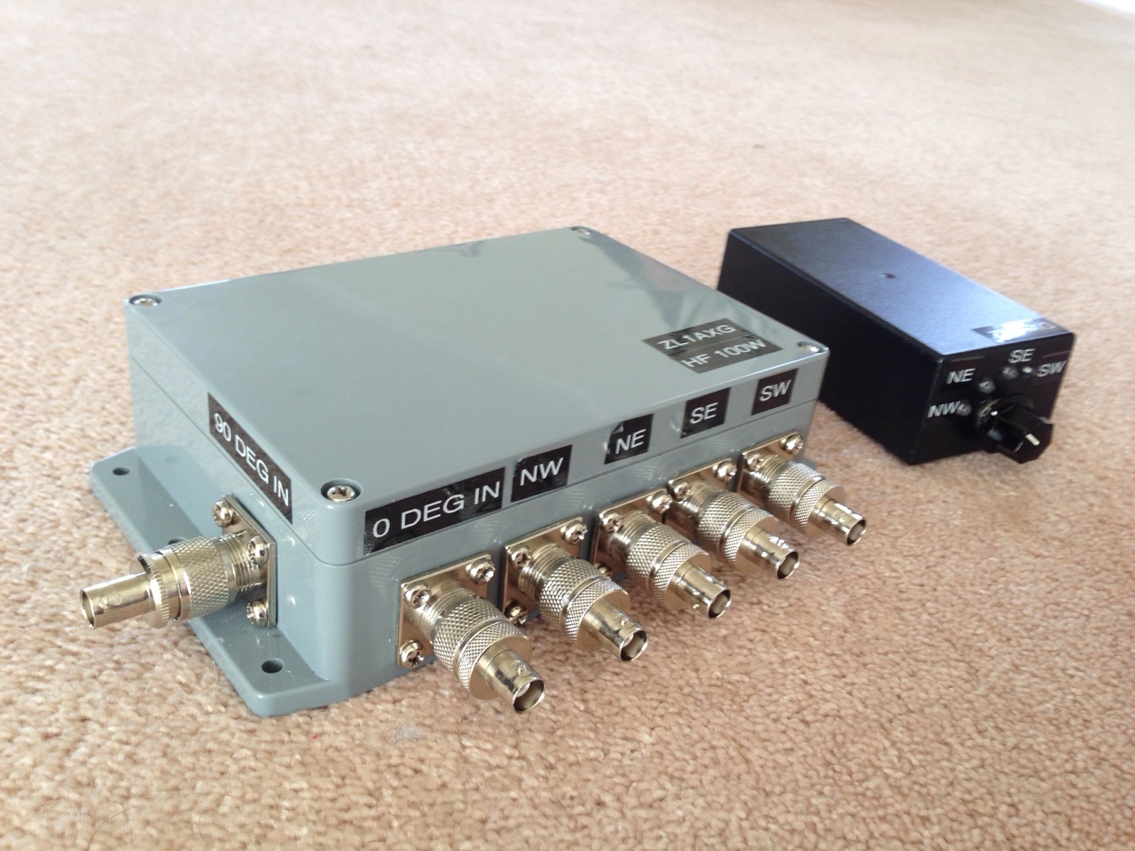 by Mike ZL1AXG A four square antenna has now been built and assembled, assisted by a number of local amateurs (Doug ZL2AOV is photographer, Bernard ZL2BD, James ZL2ET, flatmate Josh, and Malcolm ZL2UDF and myself are in assembly mode). Full testing wasn't possible because 20m at the test location in Grenada Village was full of local QRN at S6+ and peaking over S9. It did, however, pull in stations on 15m, even if it was not designed for that band! The team are busy assembling the portable four square array for 20m. The array takes about an hour to assemble: four antennas, four feedlines, a control box, coax and an ethernet line back to the rig and remote control, and 32 radials! Bernard ZL2BD measuring the impedance at the feedpoint with his antenna analyser. Note that we found in this first test that the initial feed arrangement wasn't satisfactory, creating too much coupling to ground. Doug reworked the "feet" giving them nice painted toenails (in British racing green). I started this project with the intention of engendering interest in phased vertical arrays. I imagine that the club will get to play with this antenna (and hopefully others like it) in our annual efforts in Oceania DX Contest and CQ WW contests. 20m was picked as a starting band because element lengths are manageable (approx. 5m). If there is a band where your signal needs to stand out in a contest then it would be 20m! A four square has around 5.5dB of gain over a monopole, similar to a horizontal beam antenna. However, all assembly is done on the ground, there is no rotator and it is very quick to switch directions. What a tiny box! James ZL2ET and Mike ZL1AXG can be seen pointing at the controller. You can spot the 1/4 wave current forcing 75 ohm feed-lines from the controller box to each monopole. The control box and remote unit The controller is not frequency dependent - containing only switching equipment (3 DPDT relays) and a broadband transformer. To get the 90 degree offset for the centre radiators you use two pieces of coax, in a Christman matching arrangement. The lengths are calculated using a computer program downloadable from W7EL's website at EZNEC.com. You simply input the impedances of the component monopole antennas measured using an antenna analyser, the configuration of the array, frequency and velocity factor of the coax. Out pops the lengths of coax to be cut in metres. The program solves two complex number calculations behind the scenes. Simple! The two pieces of 75 ohm coax (one is 2.395m long, the other is 7.799m long) are joined together with a Tee connector creating a common voltage feedpoint where they are fed with 50 ohm coax (grey RG8U) from the rig. These feeders plug into the controller, giving 0 (rear element) and 90 degrees (centre elements) of phase difference. The 180 degree shift (front element) is achieved using a broadband transformer constructed on a FET240 type 43 ferrite toroid sourced from SICOM Ltd. I am working on constructing a hybrid coupler as well, in order to compare the different feed arrangements. Hybrid couplers are frequency specific as they contain both inductance and capacitance. They are popular in commercial units as they are not as sensitive to the antenna feedpoint impedance. Some say they are more lossy than Christman feed. We shall see! A special thanks to Malcolm ZL2UDF who provided the aluminium tubing for the four antennas (ex Quartz Hill 20m beam), Bernard for assistance in calculating the 1/4 wavelength feeder lengths and velocity factor of the 75 ohm coax and supplying the antenna analyser, and Doug ZL2AOV who reworked the "feet" and connection mechanisms for the antennas, and resolved the resonance issue so that they tuned up properly. At the next club meeting on Wednesday 19 November at 7.30pm, you will hear me talk a bit more about phased vertical arrays in general. I will discuss why these arrays make sense for contesting, basic configurations (2, 3, 4 or more elements), switching and feed arrangements. I will also cover off practical design ideas for both this portable four square and my as yet unfinished two element multi-band array under construction.