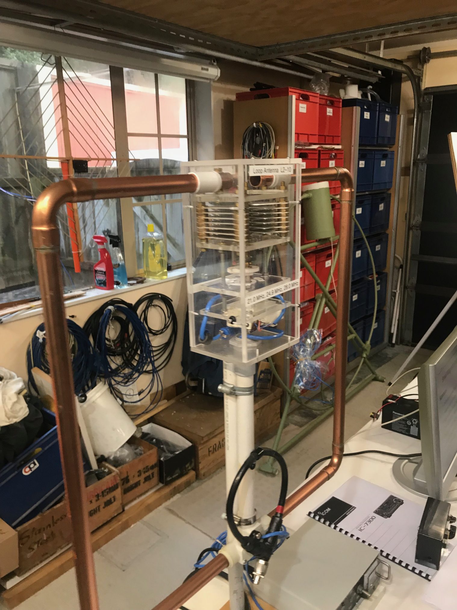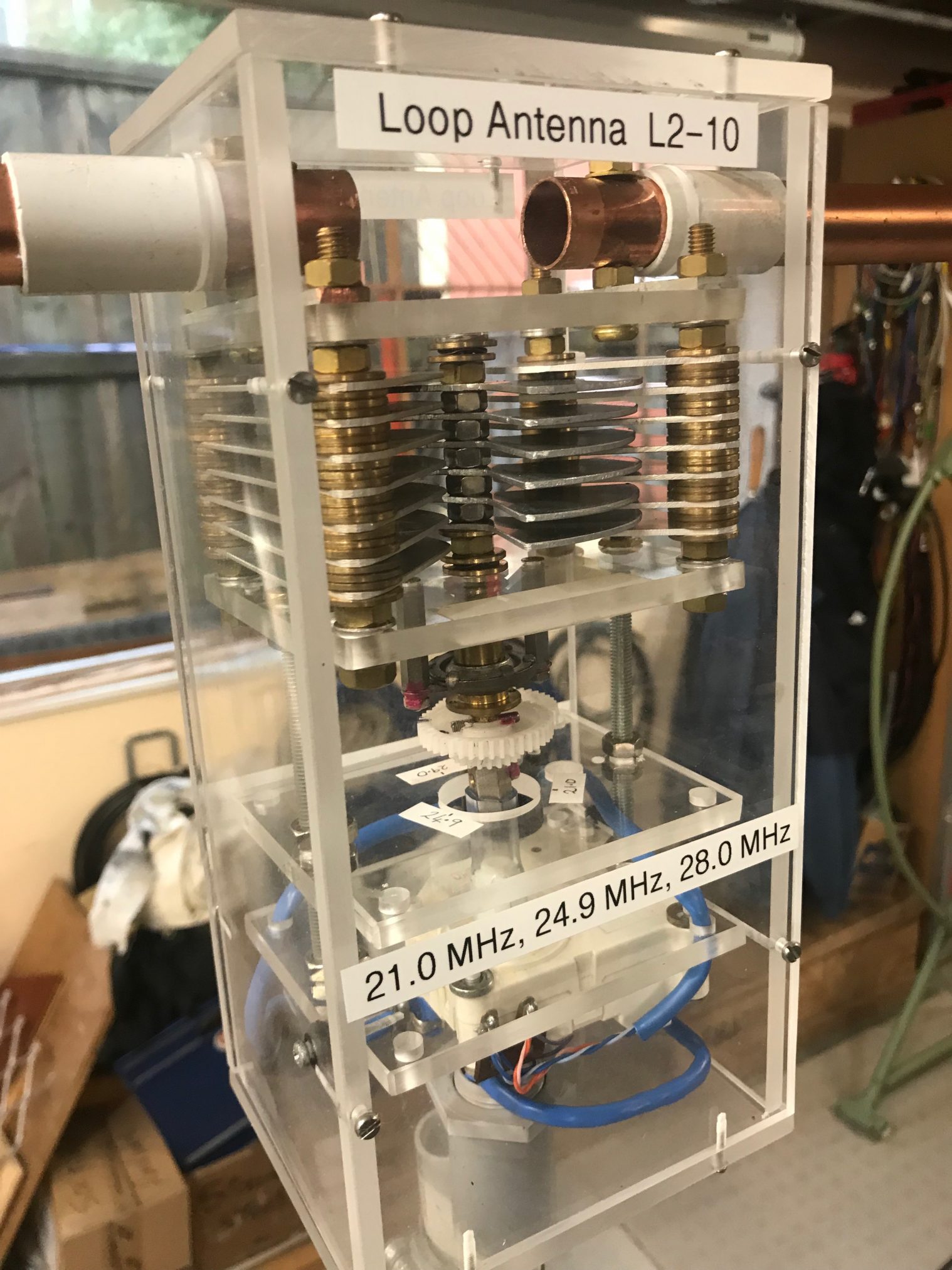 Bernard led off on the third shed workshop for 2018 which was on the topic of "Magnetic loop antennas". These antennas are great for getting better signal to noise levels out of typical noisy suburban environments. They are also compact and can be mounted on a boundary fence or building to blend into an urban environment. On transmit they are less sensitive to changes in the surrounding environment (e.g. resonance changes observable on wire antennas with wet weather). Ten members turned out on Sunday 1 July 2018. A summary of his presentation, theory of magnetic loop antennas and instructions for constructing these antennas can be downloaded here: [wpdm_package id='3462'] Bernard can be seen giving a presentation to kick off:Several examples of loop antennas were available for inspection including this multiband loop for 15m through 10m:And a close up of the butterfly tuning capacitor:The feedpoint and feed system:And finally, a mag loop controller box that Bernard has constructed (he has several!):A special price has been worked out for branch members who wish to assemble their own butterfly-style tuning capacitor. This is required if you wish to make a small magnetic loop for receive and transmit. Contact Bernard if you would like to order a kit. A subsequent workshop will focus on assembly of the capacitors, and give further information on other construction details and where to acquire the further parts required in construction.
